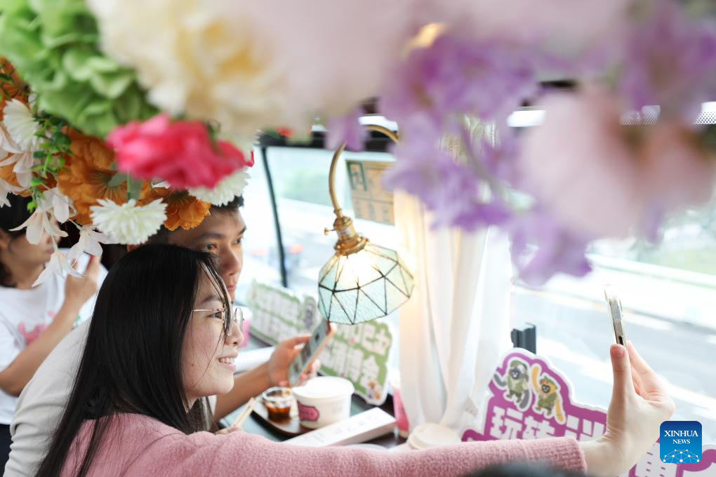Tourists take photos on the Laobacha Haikou Bus's China International Consumer Products Expo special route in Haikou, south China's Hainan Province, April 6, 2025. Ahead of the upcoming fifth China International Consumer Products Expo (CICPE), the Laobacha Haikou Bus has inaugurated its CICPE special route. Laobacha is a beloved Hainan tradition where locals gather over fragrant tea, savory snacks, and leisurely chat. Featuring a panoramic sunroof and a music stage, the bus blends local culture with innovative expo-themed designs and connects popular tourist spots across the city, showcasing the charm of local tourism. (Xinhua/Zhang Liyun)