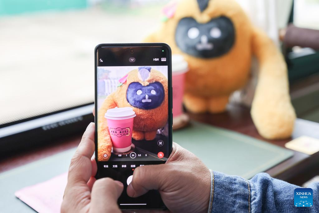A tourist takes photos of the mascot of the fifth China International Consumer Products Expo (CICPE) on the Laobacha Haikou Bus's CICPE special route in Haikou, south China's Hainan Province, April 6, 2025. Ahead of the upcoming fifth China International Consumer Products Expo (CICPE), the Laobacha Haikou Bus has inaugurated its CICPE special route. Laobacha is a beloved Hainan tradition where locals gather over fragrant tea, savory snacks, and leisurely chat. Featuring a panoramic sunroof and a music stage, the bus blends local culture with innovative expo-themed designs and connects popular tourist spots across the city, showcasing the charm of local tourism. (Xinhua/Zhang Liyun)