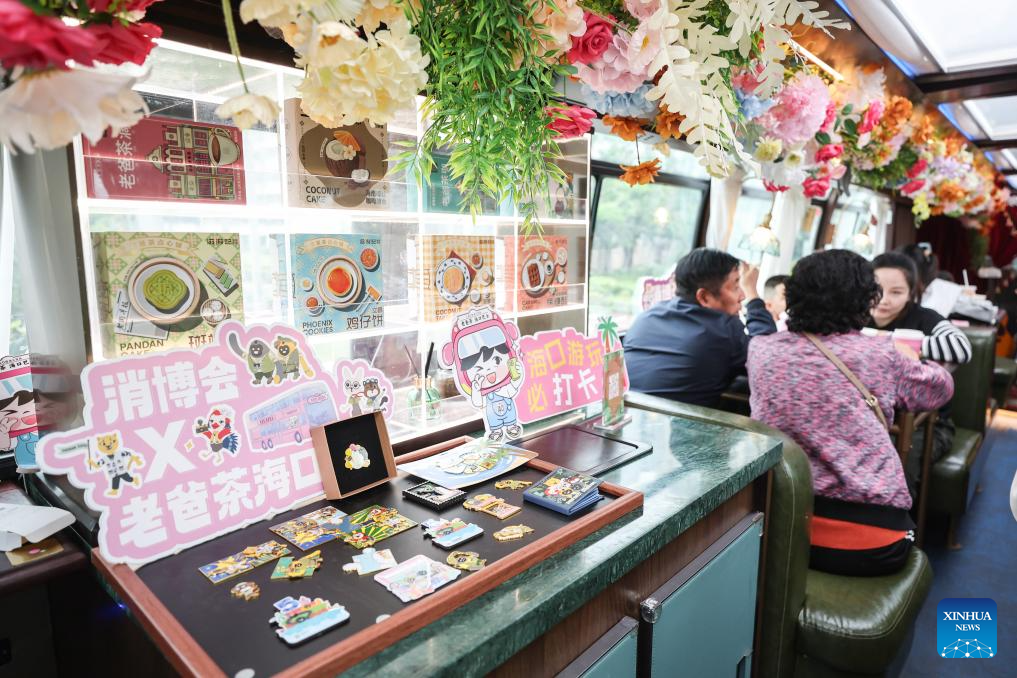 Products themed on the fifth China International Consumer Products Expo (CICPE) are seen on the Laobacha Haikou Bus's CICPE special route in Haikou, south China's Hainan Province, April 6, 2025. Ahead of the upcoming fifth China International Consumer Products Expo (CICPE), the Laobacha Haikou Bus has inaugurated its CICPE special route. Laobacha is a beloved Hainan tradition where locals gather over fragrant tea, savory snacks, and leisurely chat. Featuring a panoramic sunroof and a music stage, the bus blends local culture with innovative expo-themed designs and connects popular tourist spots across the city, showcasing the charm of local tourism. (Xinhua/Zhang Liyun)