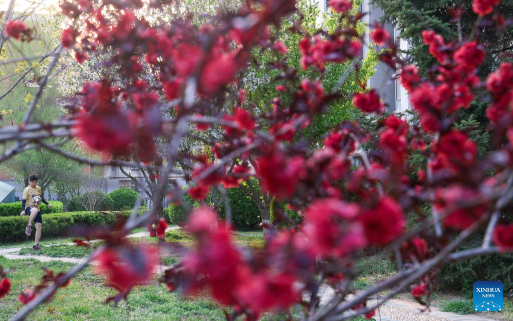 A citizen plays football at a garden in Beijing, capital of China, April 6, 2025. Qingming Festival, or Tomb-Sweeping Day, falls on April 4 this year. It is a traditional Chinese festival for people to pay tribute to the dead and worship their ancestors. The holiday also provides a short break for Chinese citizens as they engage in outdoor activities and sightseeing. (Xinhua/Yin Gang)