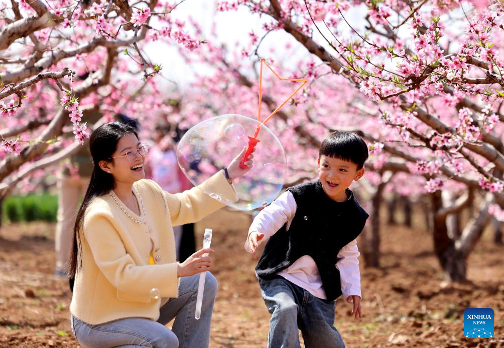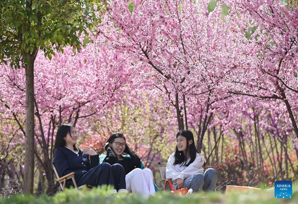 Tourists enjoy leisure time at a garden in Zaozhuang City, east China's Shandong Province, April 6, 2025. Qingming Festival, or Tomb-Sweeping Day, falls on April 4 this year. It is a traditional Chinese festival for people to pay tribute to the dead and worship their ancestors. The holiday also provides a short break for Chinese citizens as they engage in outdoor activities and sightseeing. (Photo by Sun Zhongzhe/Xinhua)