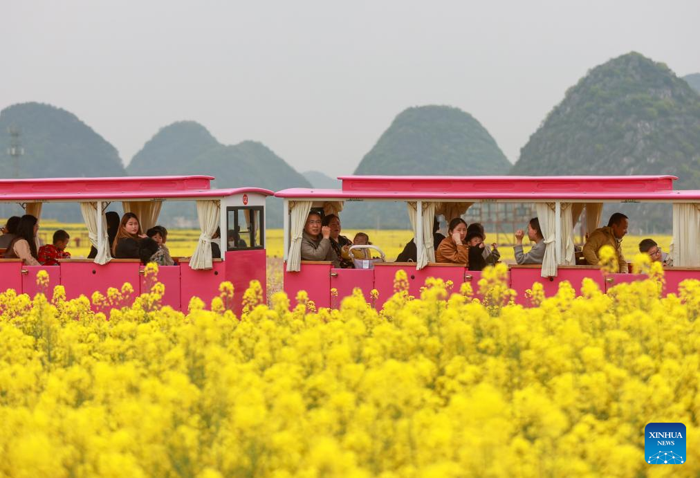People take a sightseeing train across cole flower fields in Pingyuan Village, Anshun City of southwest China's Guizhou Province, April 6, 2025. Qingming Festival, or Tomb-Sweeping Day, falls on April 4 this year. It is a traditional Chinese festival for people to pay tribute to the dead and worship their ancestors. The holiday also provides a short break for Chinese citizens as they engage in outdoor activities and sightseeing. (Photo by Yuan Fuhong/Xinhua)