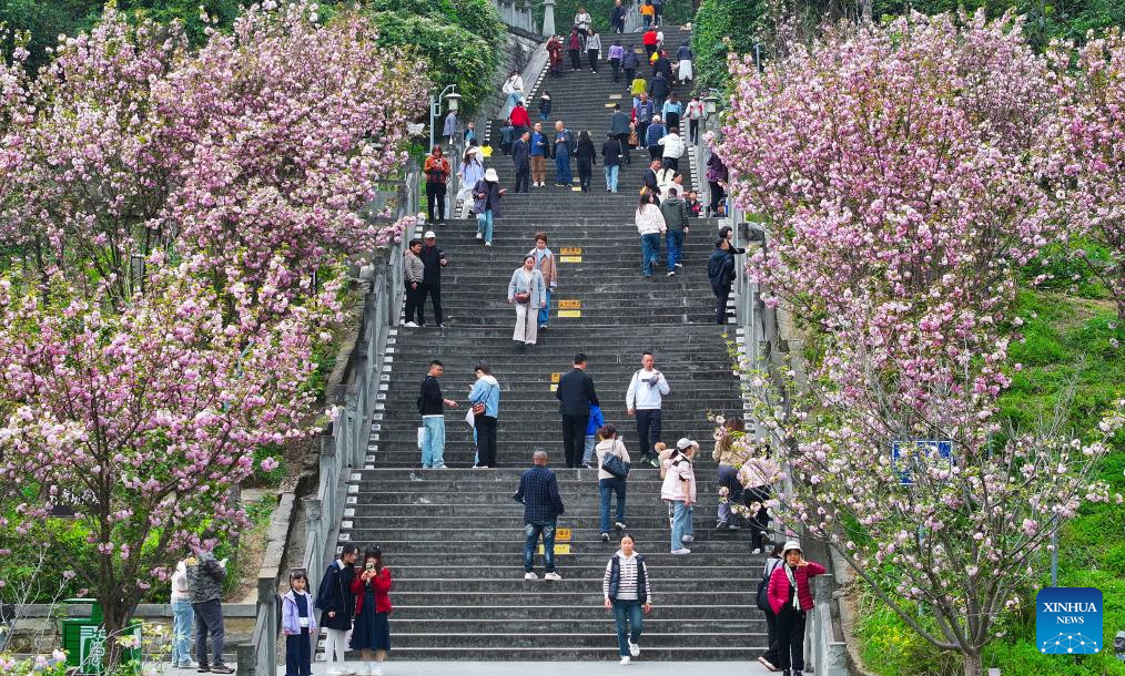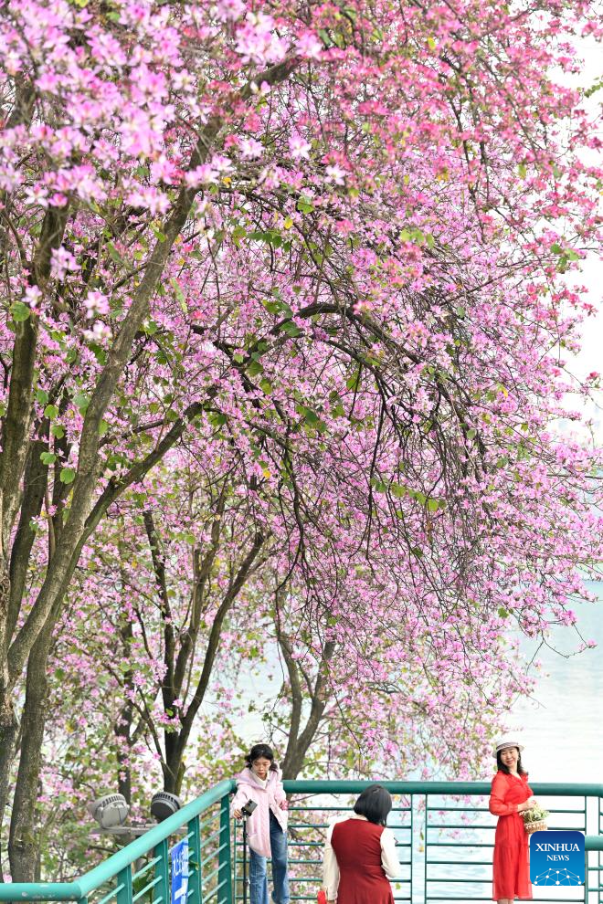 People pose for photos under a blooming bauhinia tree in Liuzhou, south China's Guangxi Zhuang Autonomous Region, April 6, 2025. Qingming Festival, or Tomb-Sweeping Day, falls on April 4 this year. It is a traditional Chinese festival for people to pay tribute to the dead and worship their ancestors. The holiday also provides a short break for Chinese citizens as they engage in outdoor activities and sightseeing. (Photo by Li Hanchi/Xinhua)