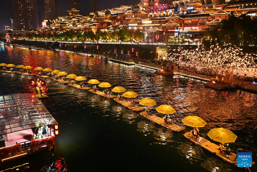 People take bamboo raft rides for sightseeing at night on Gongshui River in Xuan'en County, central China's Hubei Province, April 5, 2025. Qingming Festival, or Tomb-Sweeping Day, falls on April 4 this year. It is a traditional Chinese festival for people to pay tribute to the dead and worship their ancestors. The holiday also provides a short break for Chinese citizens as they engage in outdoor activities and sightseeing. (Photo by Song Wen/Xinhua)