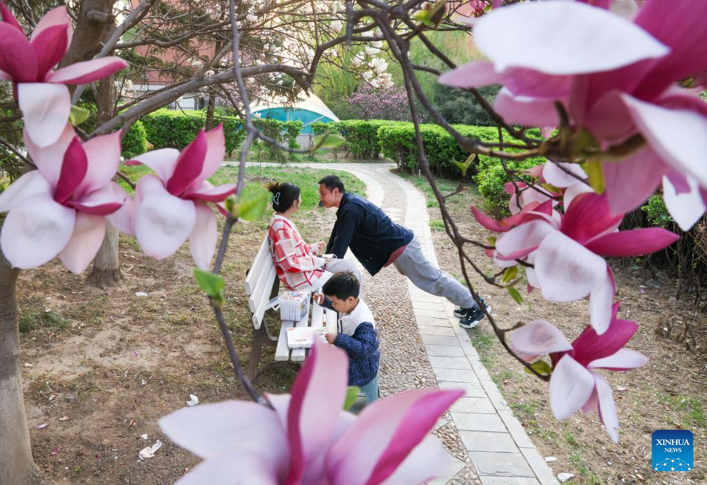 A family enjoys leisure time at a park in Beijing, capital of China, April 6, 2025. Qingming Festival, or Tomb-Sweeping Day, falls on April 4 this year. It is a traditional Chinese festival for people to pay tribute to the dead and worship their ancestors. The holiday also provides a short break for Chinese citizens as they engage in outdoor activities and sightseeing. (Xinhua/Yin Gang)