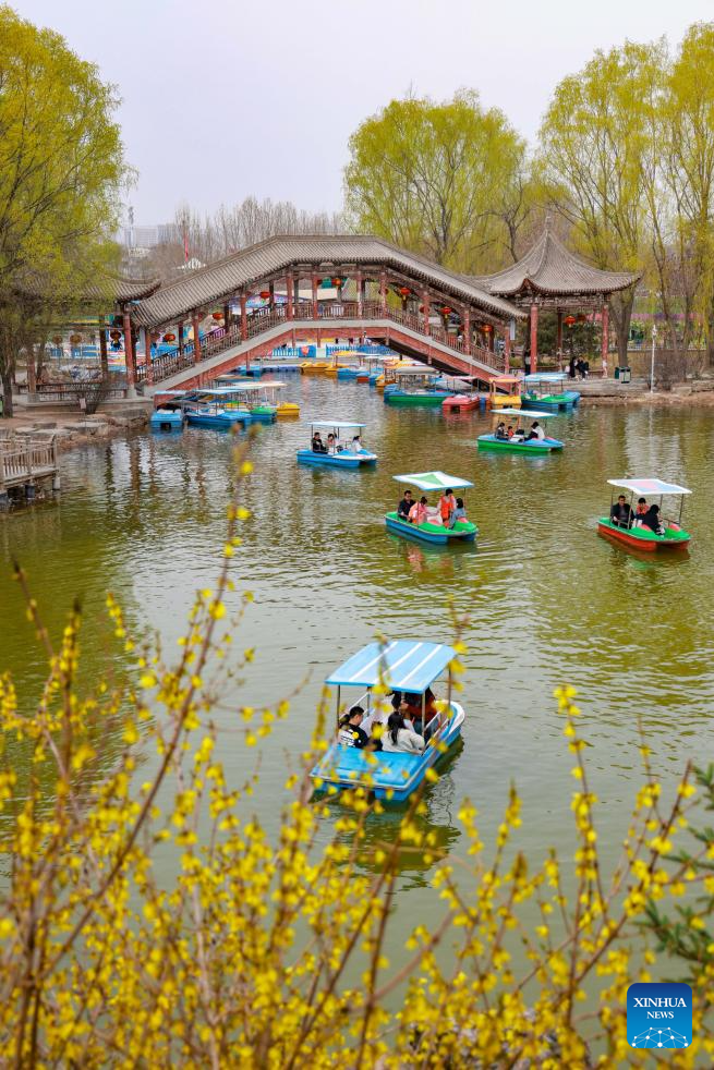 People take boats for sightseeing at a park in Lanzhou City, northwest China's Gansu Province, April 6, 2025. Qingming Festival, or Tomb-Sweeping Day, falls on April 4 this year. It is a traditional Chinese festival for people to pay tribute to the dead and worship their ancestors. The holiday also provides a short break for Chinese citizens as they engage in outdoor activities and sightseeing. (Photo by Jin Wangui/Xinhua)