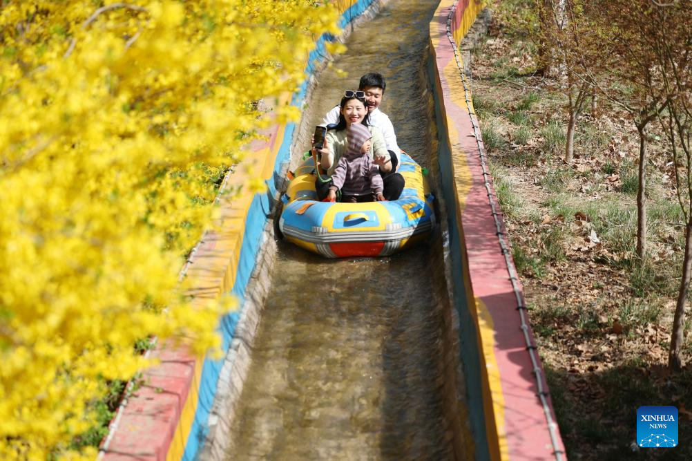 People experience drifting in Zhuquan Village, Linyi City of east China's Shandong Province, April 6, 2025. Qingming Festival, or Tomb-Sweeping Day, falls on April 4 this year. It is a traditional Chinese festival for people to pay tribute to the dead and worship their ancestors. The holiday also provides a short break for Chinese citizens as they engage in outdoor activities and sightseeing. (Photo by Wang Yanbing/Xinhua)