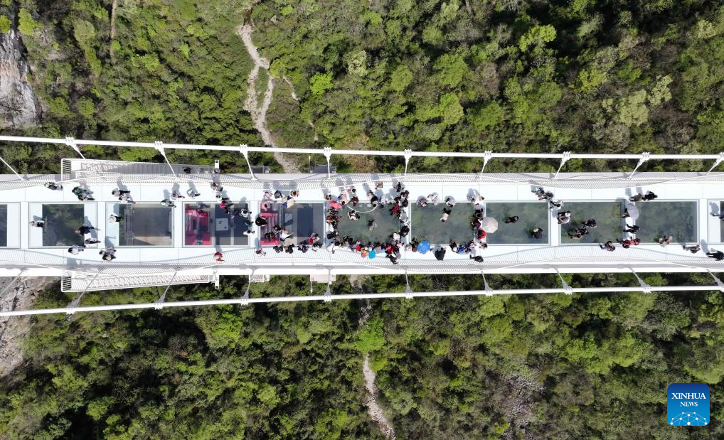 An aerial drone photo taken on April 6, 2025 shows people walking on a glass bridge at a grand canyon in Zhangjiajie, central China's Hunan Province. Qingming Festival, or Tomb-Sweeping Day, falls on April 4 this year. It is a traditional Chinese festival for people to pay tribute to the dead and worship their ancestors. The holiday also provides a short break for Chinese citizens as they engage in outdoor activities and sightseeing. (Photo by Wu Yongbing/Xinhua)