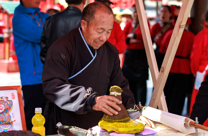 An artist demonstrates the crafting process of woodblock New Year paintings at a fair featuring intangible cultural heritage at the Millennium City Park in Kaifeng city, central China's Henan Province, during the 2025 Kaifeng Qingming Cultural Festival. The woodblock New Year paintings originated from Zhuxian township in Kaifeng city. (Photo by Yao Ziwen)