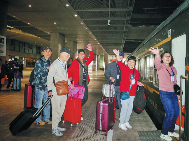 Passengers pose for photographs before boarding a train specially for senior travelers at a railway station in Shanghai. LIU WEIXING/XINHUA