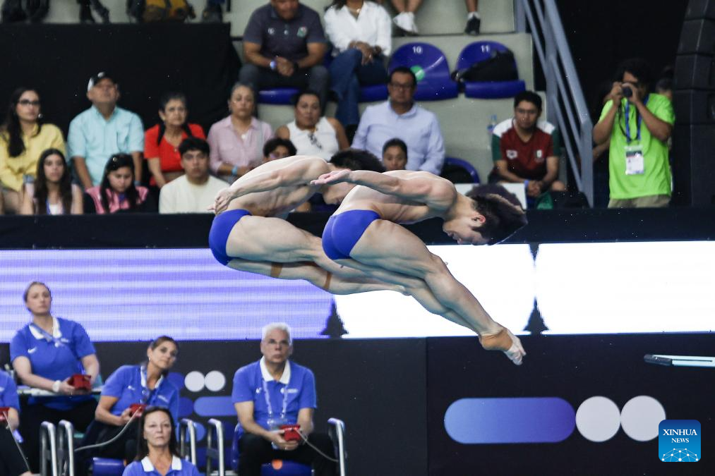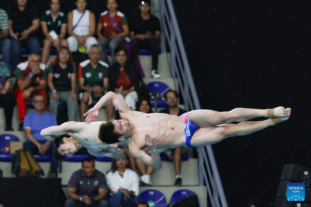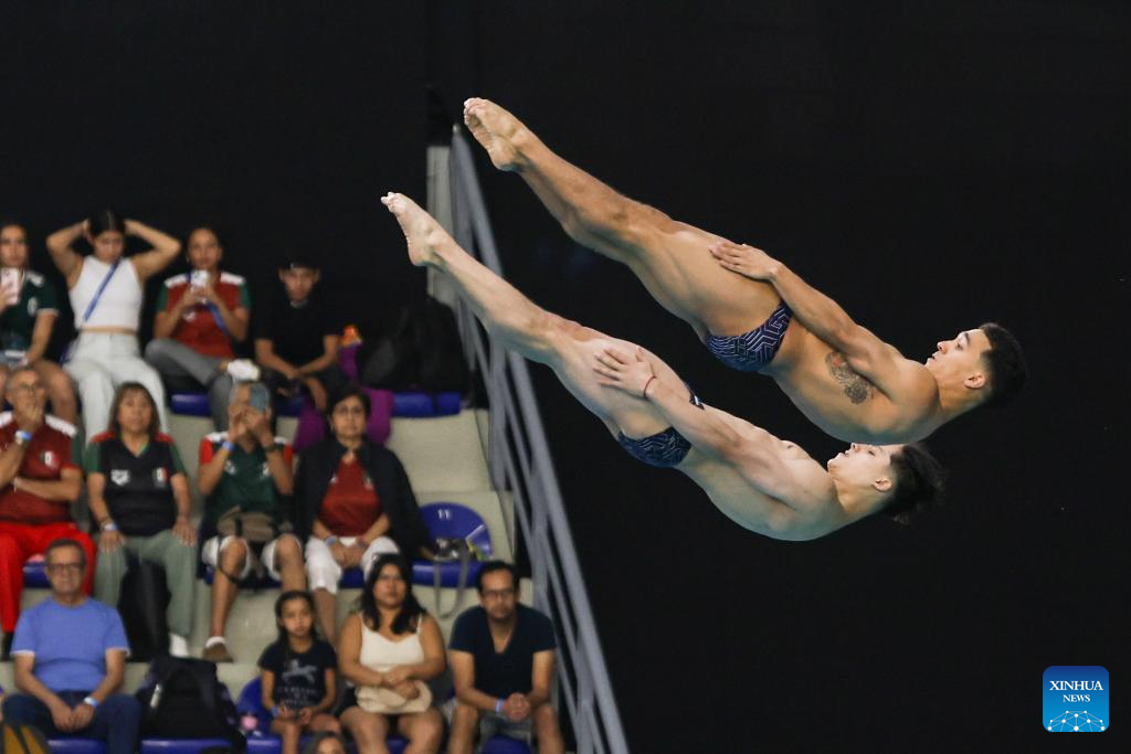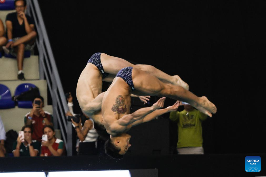 Juan Manuel Celaya Hernandez/Osmar Olvera Ibarra of Mexico compete during the men's Synchronized 3m springboard final at the World Aquatics Diving World Cup 2025 in Guadalajara, Jalisco, Mexico, on April 6, 2025. (Photo by Diana Marquez/Xinhua)