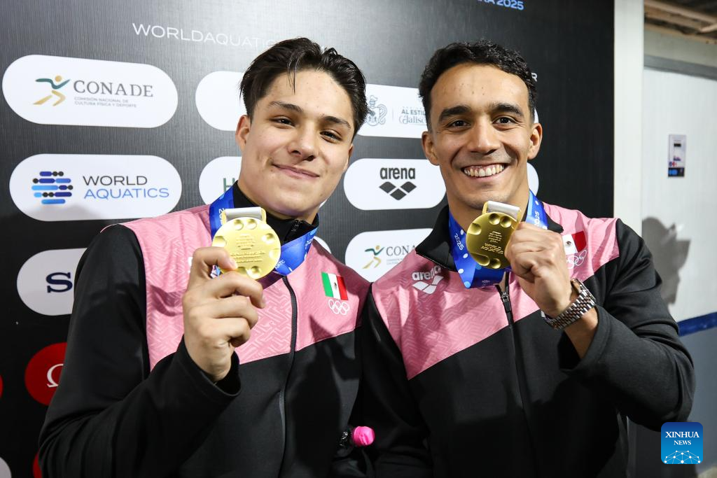 Gold medalists Juan Manuel Celaya Hernandez (R)/Osmar Olvera Ibarra of Mexico pose after the awarding ceremony of the men's Synchronized 3m springboard event at the World Aquatics Diving World Cup 2025 in Guadalajara, Jalisco, Mexico, on April 6, 2025. (Photo by Diana Marquez/Xinhua)