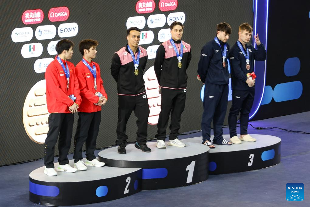Gold medalists Juan Manuel Celaya Hernandez (3rd L)/Osmar Olvera Ibarra (3rd R)of Mexico, silver medalists Hu Yukang (1st L)/Zheng Jiuyuan (2nd L)of China and bronze medalists Anthony Harding (2nd R)/Jack Laugher of Britain attend the awarding ceremony for the men's synchronized 3m springboard event at the World Aquatics Diving World Cup 2025 in Guadalajara, Jalisco, Mexico, on April 6, 2025. (Photo by Diana Marquez/Xinhua)