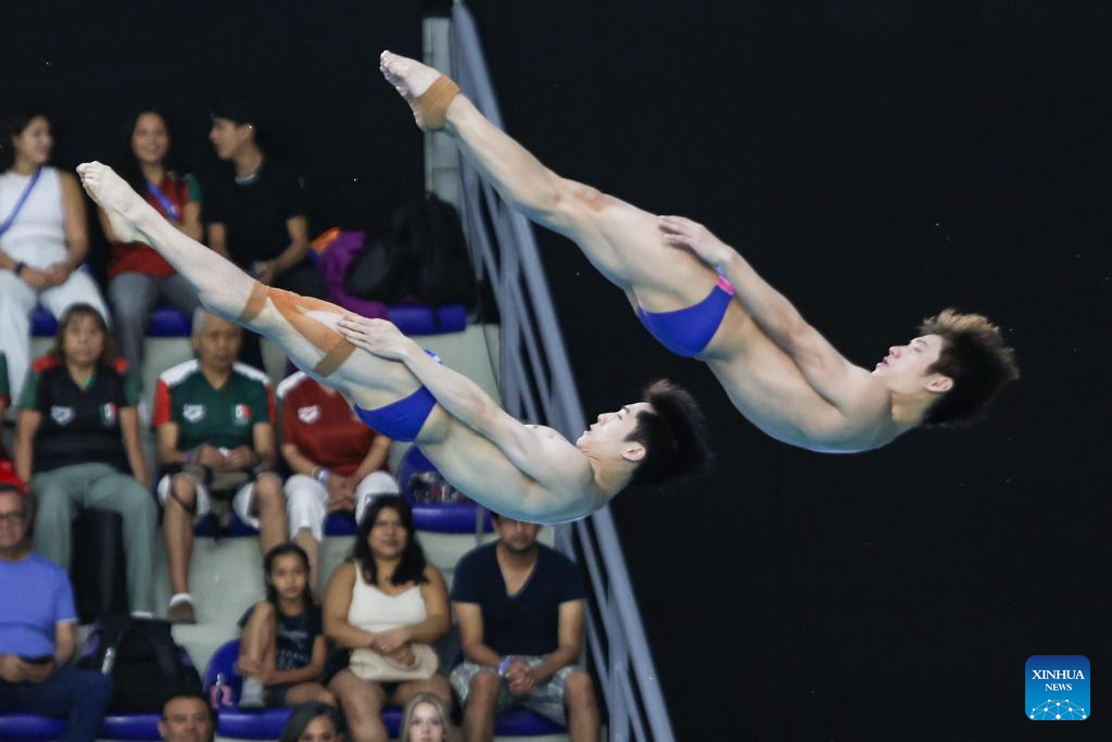 Hu Yukang/Zheng Jiuyuan of China compete during the men's Synchronized 3m springboard final at the World Aquatics Diving World Cup 2025 in Guadalajara, Jalisco, Mexico, on April 6, 2025. (Photo by Diana Marquez/Xinhua)