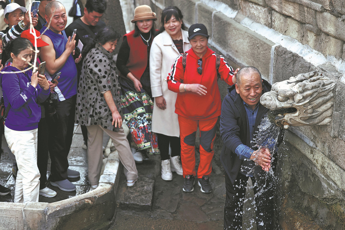 A senior visitor washes his hands in spring water at Jinci Temple on March 24. [Photo by Zhu Xingxin/China Daily]