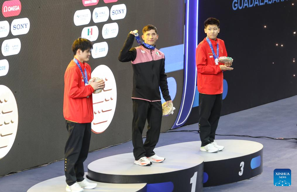 Gold medalist Randal Willars Valdez (C) of Mexico, silver medalist Zhu Zifeng (L) and bronze medalist Cheng Zilong of China pose during the awarding ceremony for the men's 10m platform final at the World Aquatics Diving World Cup 2025 in Guadalajara, Jalisco, Mexico, on April 6, 2025. (Photo by Diana Marquez/Xinhua)