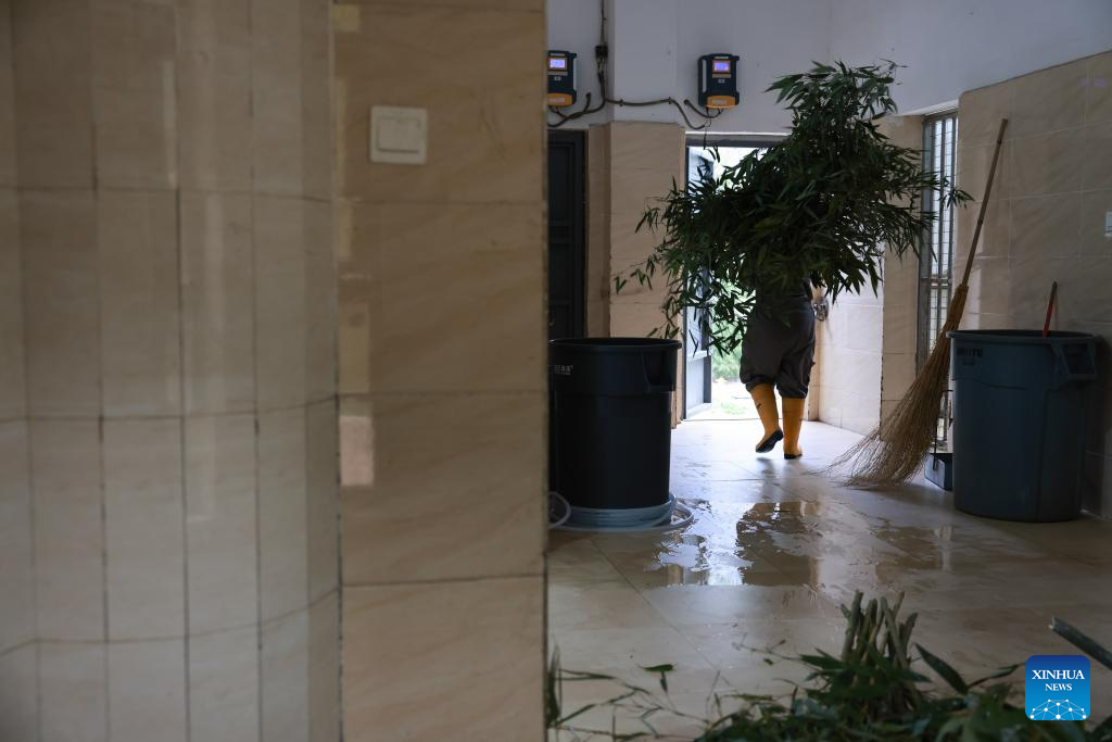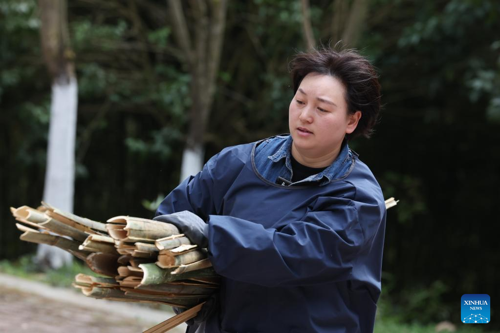 Giant panda keeper Li Rong clears up bamboo left by the pandas from the previous day at the Shenshuping giant panda base of Wolong National Nature Reserve in southwest China's Sichuan Province, March 28, 2025. (Xinhua/Xu Bingjie)