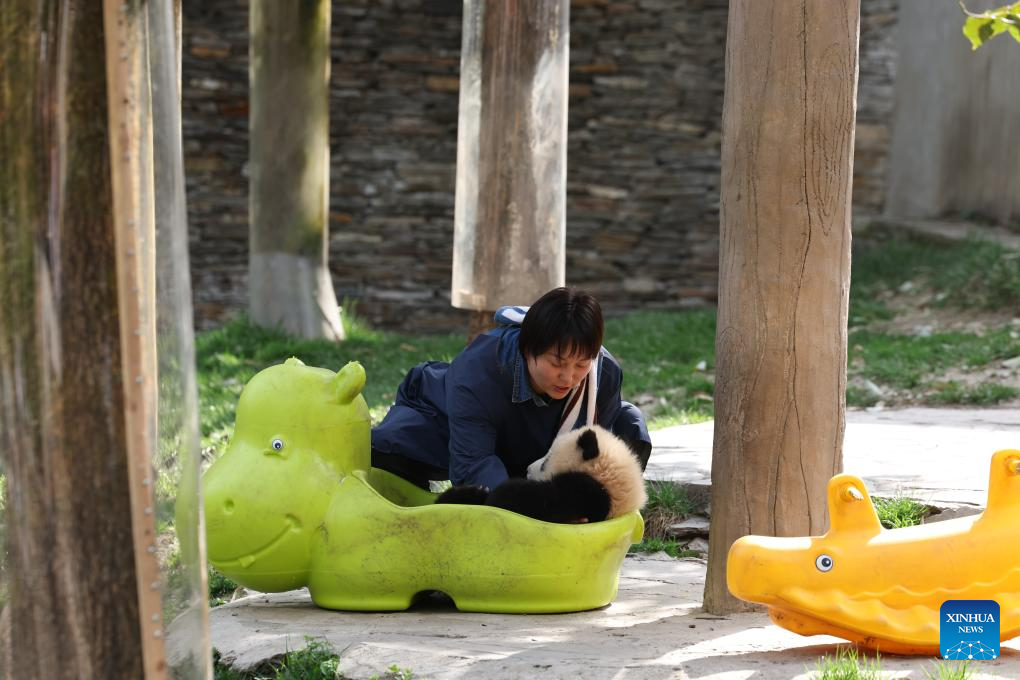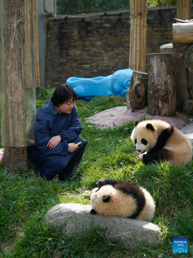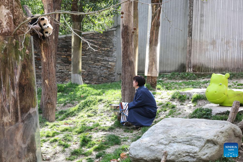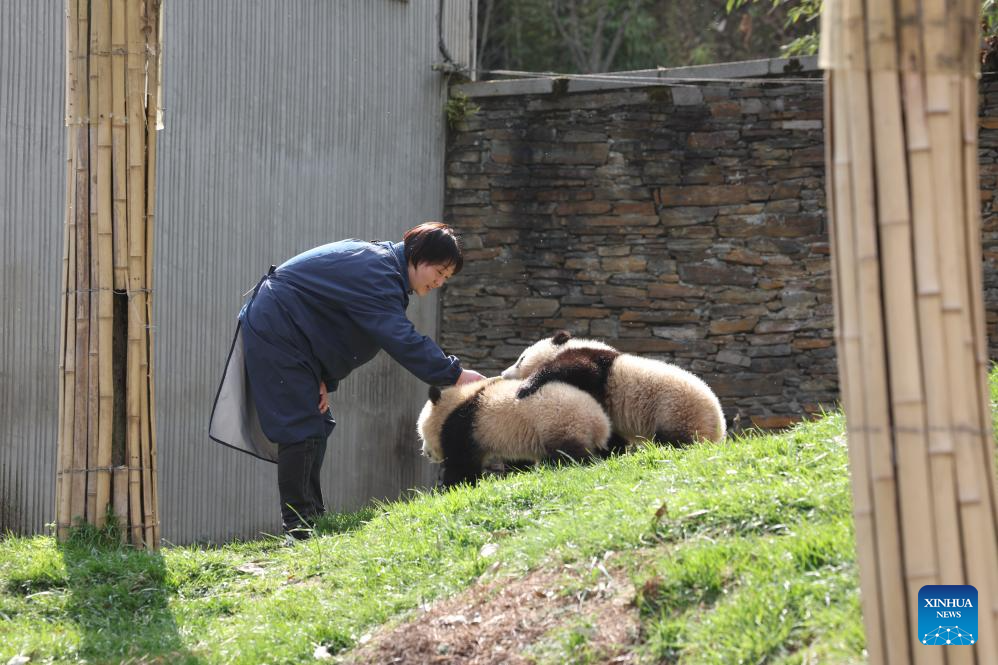 Giant panda keeper Li Rong interacts with panda cubs at the Shenshuping giant panda base of Wolong National Nature Reserve in southwest China's Sichuan Province, March 27, 2025. (Xinhua/Meng Tao)