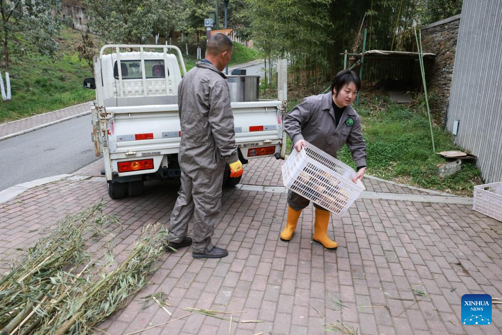 Giant panda keeper Li Rong carries bamboo for the pandas to the outside area of an enclosure at the Shenshuping giant panda base of Wolong National Nature Reserve in southwest China's Sichuan Province, March 28, 2025. (Xinhua/Meng Tao)