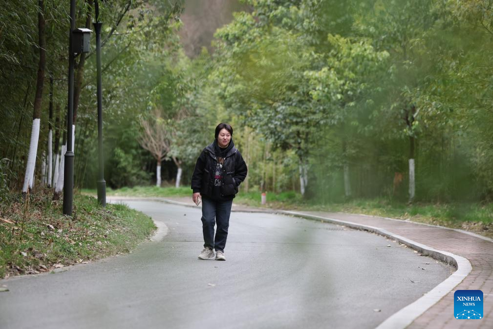 Giant panda keeper Li Rong walks on her way to work at the Shenshuping giant panda base of Wolong National Nature Reserve in southwest China's Sichuan Province, March 28, 2025. (Xinhua/Meng Tao)
