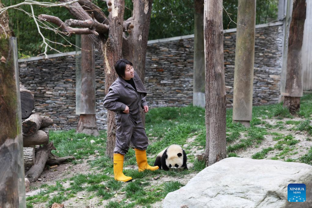 Giant panda keeper Li Rong calls panda cubs to drink milk at the Shenshuping giant panda base of Wolong National Nature Reserve in southwest China's Sichuan Province, March 27, 2025. (Xinhua/Meng Tao)