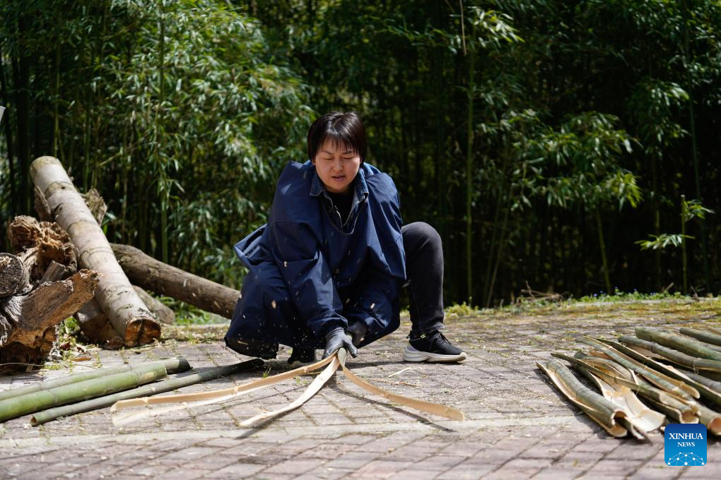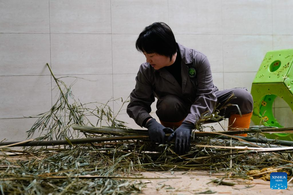 Giant panda keeper Li Rong processes bamboo before feeding the pandas at the Shenshuping giant panda base of Wolong National Nature Reserve in southwest China's Sichuan Province, March 27, 2025. (Xinhua/Xu Bingjie)