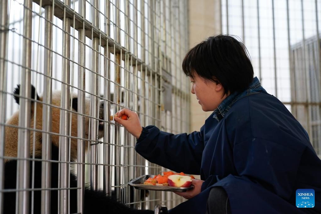 Giant panda keeper Li Rong prepares a meal for the pandas at the Shenshuping giant panda base of Wolong National Nature Reserve in southwest China's Sichuan Province, March 27, 2025. (Xinhua/Meng Tao)