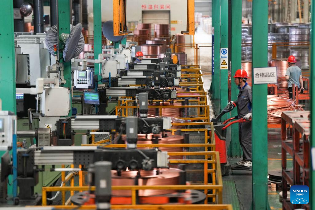 A worker checks a roll of copper pipe at Zhejiang Hailiang Limited in Diankou Town of Zhuji, east China's Zhejiang Province, April 7, 2025. Zhuji has made continuous efforts in promoting the quality development of its private sector in recent years. Home to many state-level high-tech enterprises, the city's value-added industrial output of enterprises above the designated size has maintained growth for 47 consecutive months. (Xinhua/Weng Xinyang)