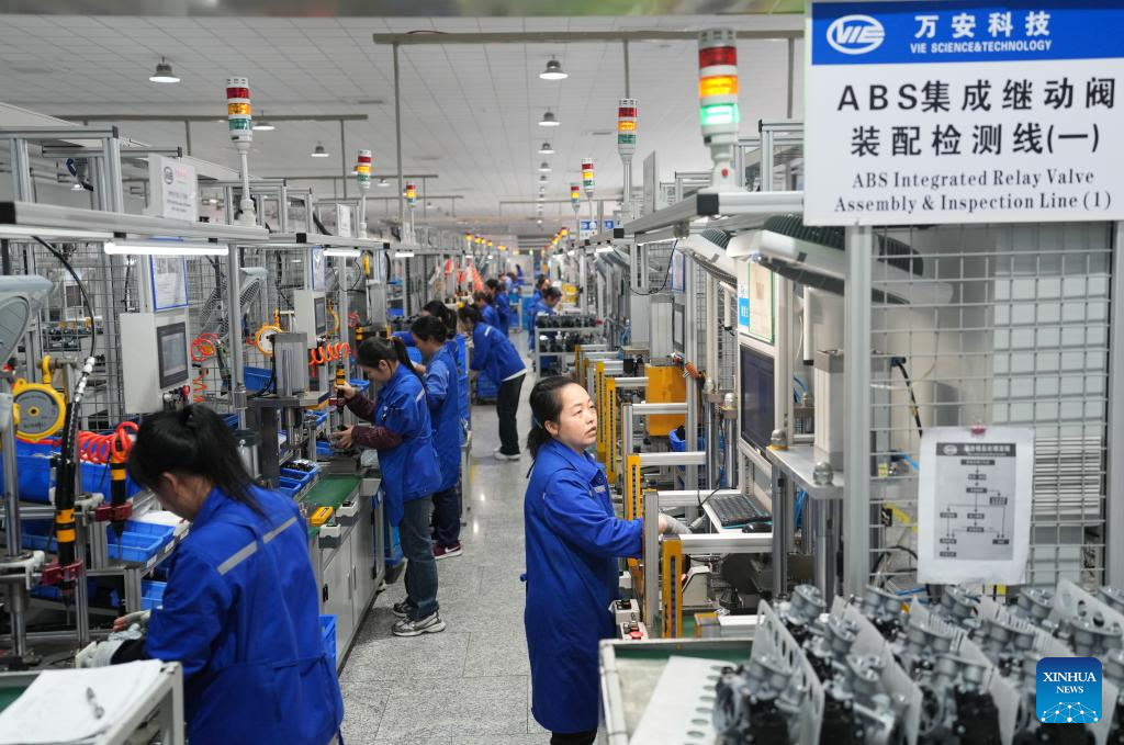 Workers are seen on the assembly and inspection line of automobile components at VIE Science and Technology Co., Ltd. in Diankou Town of Zhuji, east China's Zhejiang Province, April 7, 2025. Zhuji has made continuous efforts in promoting the quality development of its private sector in recent years. Home to many state-level high-tech enterprises, the city's value-added industrial output of enterprises above the designated size has maintained growth for 47 consecutive months. (Xinhua/Zheng Huansong)