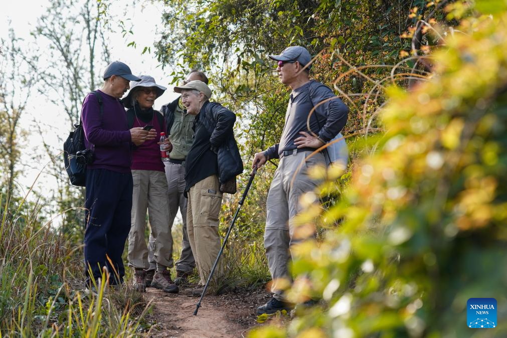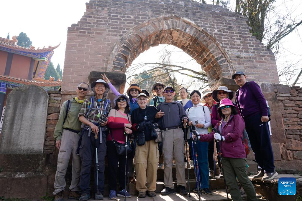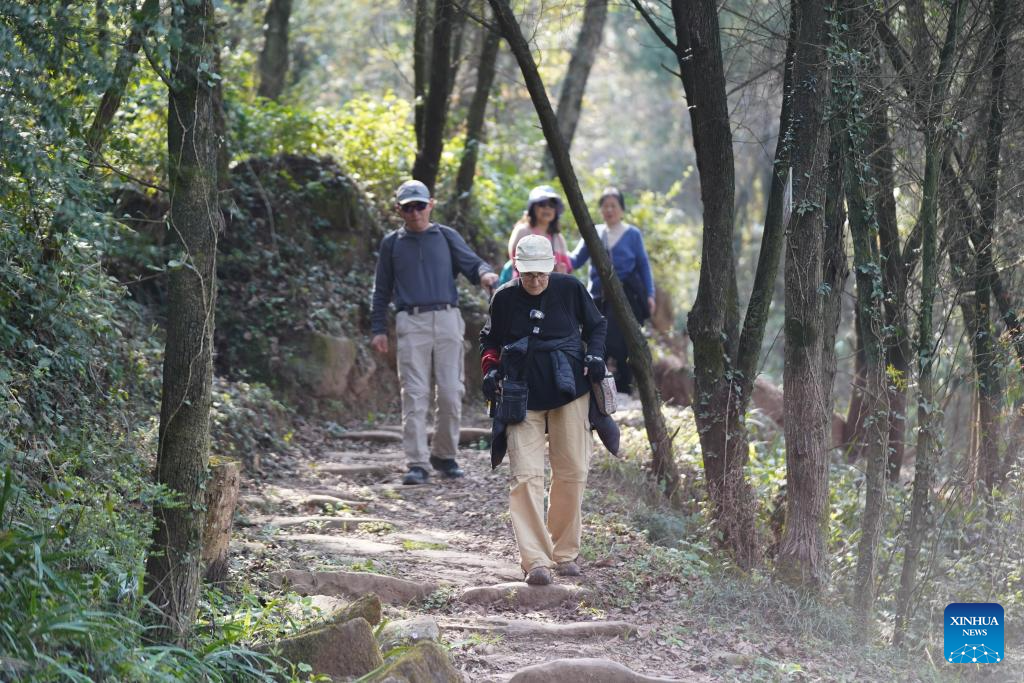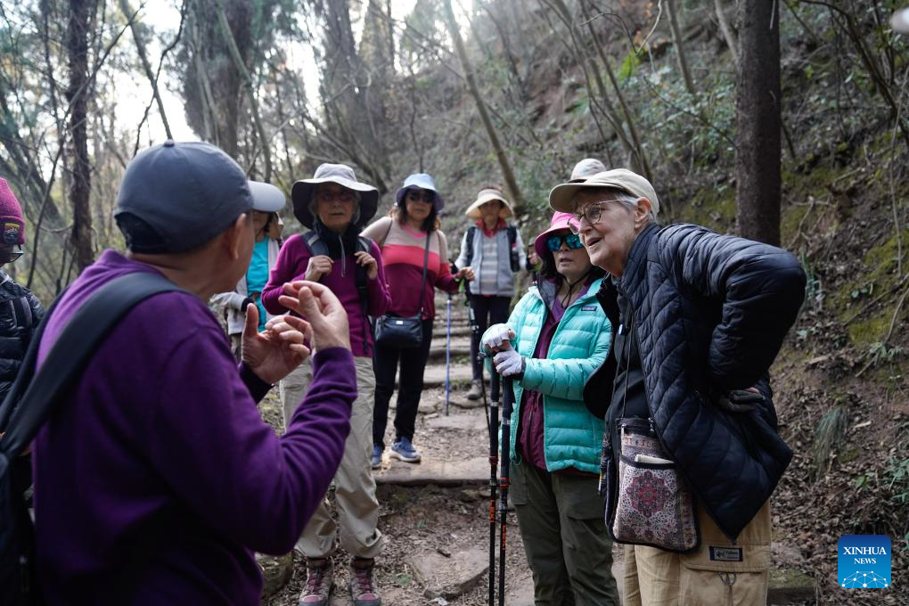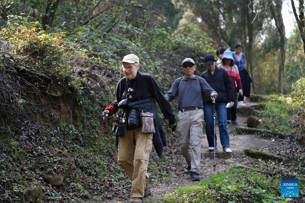 Hope Justman (2nd R) chats with her fellow hikers on the Jianmen Pass to Zhaohua ancient town section of the ancient road system "Shudao" in Guangyuan City, southwest China's Sichuan Province, March 19, 2025. (Xinhua/Xu Bingjie)