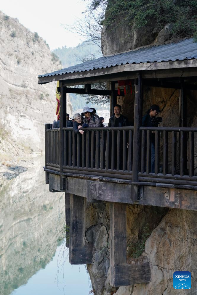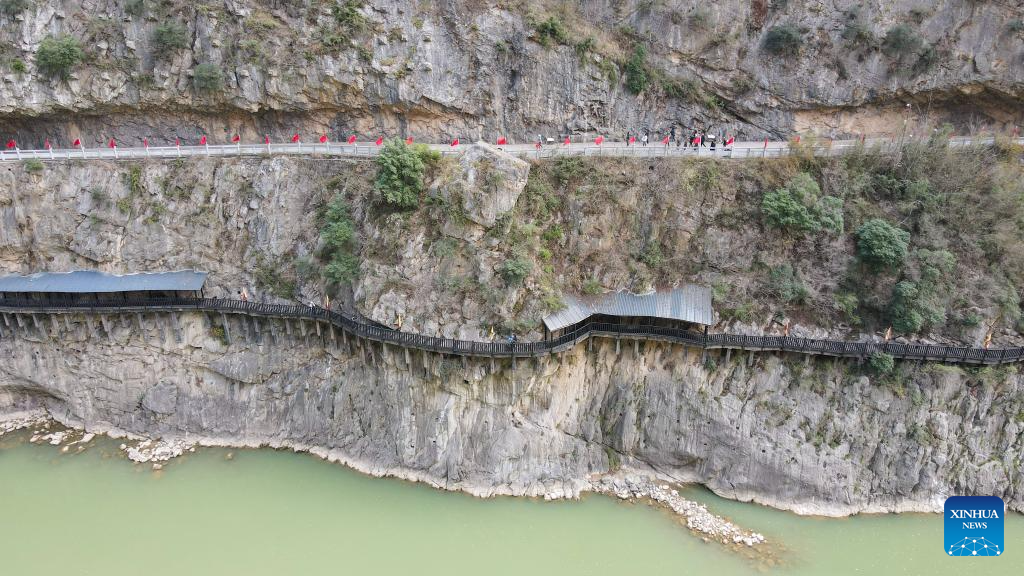 An aerial drone photo taken on March 21, 2025 shows the plank road by Mingyue Gorge (below) in Guangyuan City, southwest China's Sichuan Province. (Xinhua/Xu Bingjie)