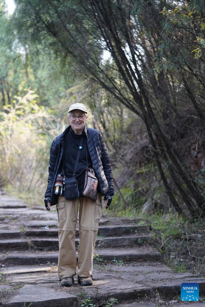 Hope Justman poses for a photo on the ancient road system "Shudao" in Guangyuan City, southwest China's Sichuan Province, March 19, 2025. (Xinhua/Xu Bingjie)