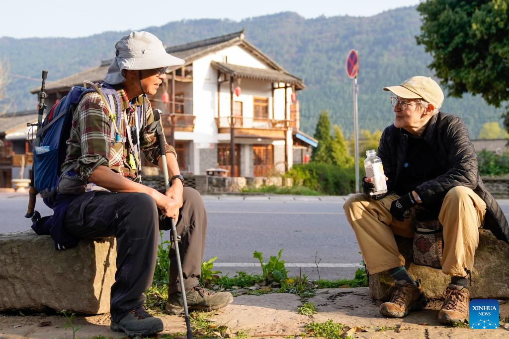 Hope Justman (R) rests and chats with her fellow hiker after hiking the Jianmen Pass to Zhaohua ancient town section of the ancient road system "Shudao" in Guangyuan City, southwest China's Sichuan Province, March 19, 2025. (Xinhua/Xu Bingjie)