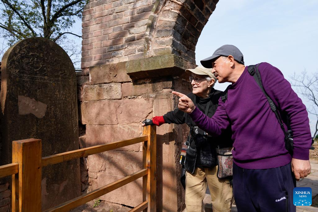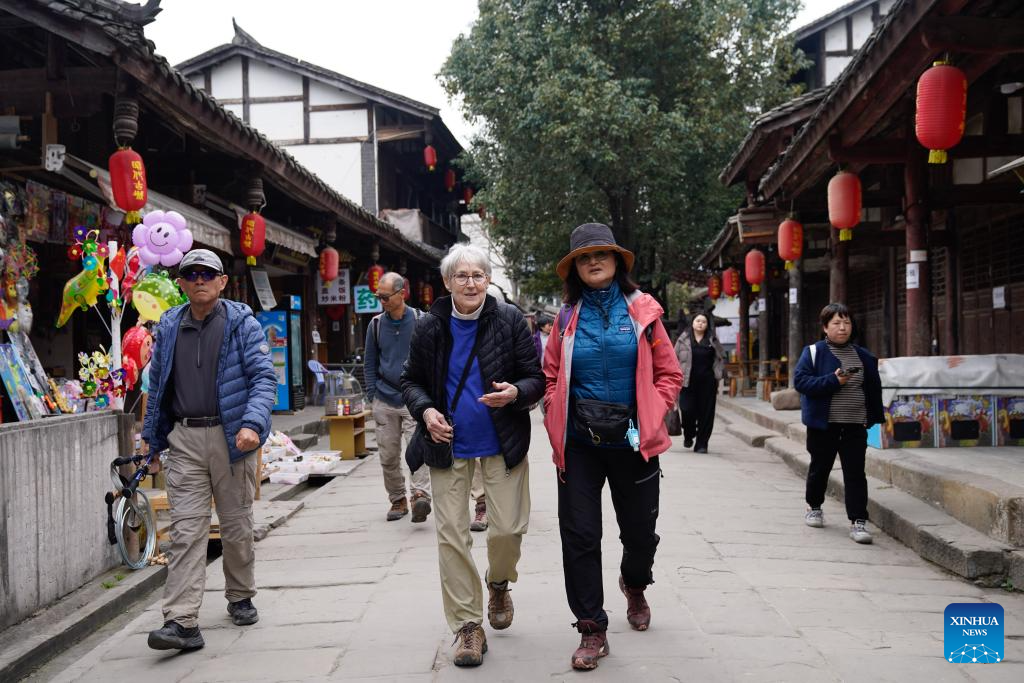 Hope Justman (C) visits Zhaohua ancient town with her fellow hikers in Guangyuan City, southwest China's Sichuan Province, March 20, 2025. (Xinhua/Xu Bingjie)