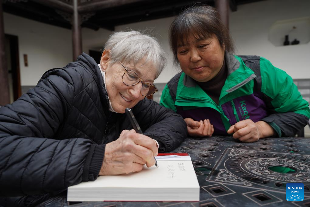 Hope Justman (L) signs her book with a note for her friend Hu Chaoqun, a restaurant owner at Zhaohua ancient town, in Guangyuan City, southwest China's Sichuan Province, March 20, 2025. (Xinhua/Xu Bingjie)