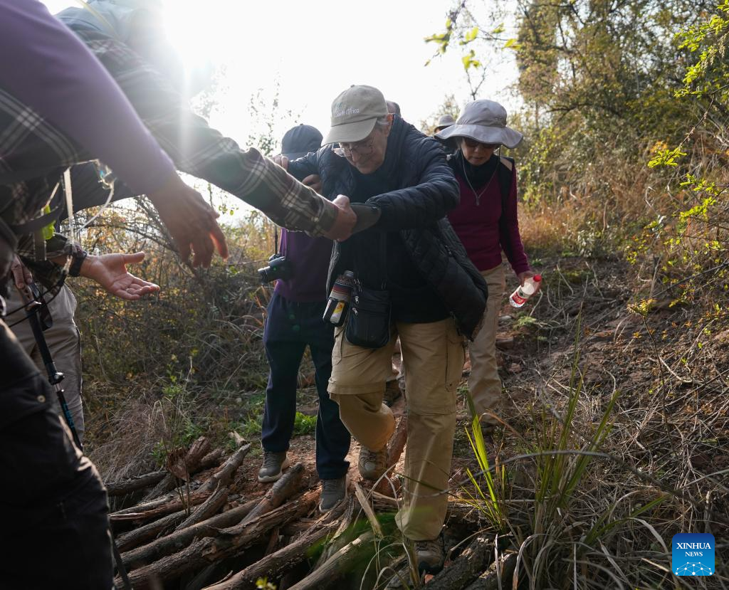 Hope Justman (1st L) explains construction techniques of plank roads to her fellow hikers at Mingyue Gorge scenic area in Guangyuan City, southwest China's Sichuan Province, March 21, 2025. (Xinhua/Xu Bingjie)