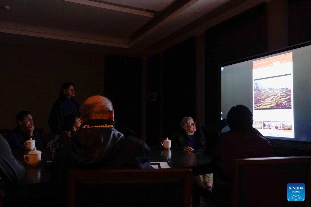 Hope Justman shows photos of the ancient road system "Shudao" that she took in the past in Guangyuan City, southwest China's Sichuan Province, March 20, 2025. (Xinhua/Xu Bingjie)
