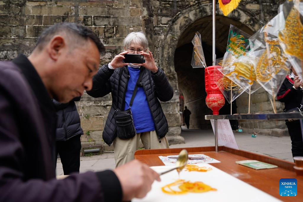 Hope Justman records the process of making a sugar painting at Zhaohua ancient town in Guangyuan City, southwest China's Sichuan Province, March 20, 2025. (Xinhua/Xu Bingjie)