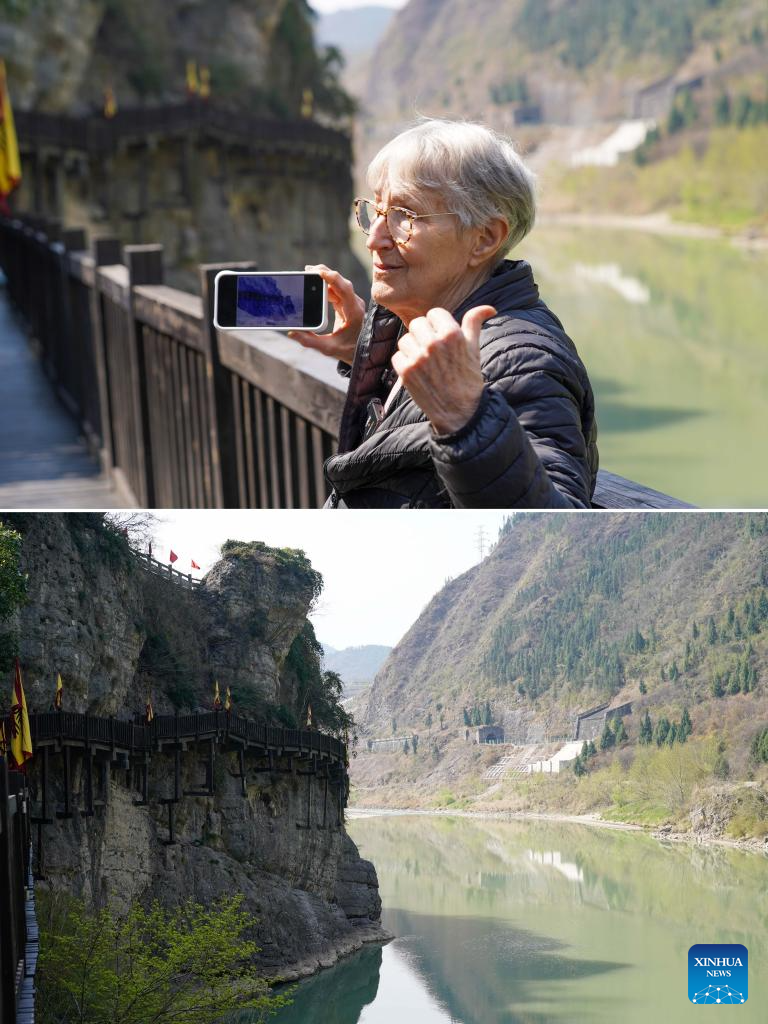 This combo photo taken on March 21, 2025 shows Hope Justman sharing a photo of the plank road by Mingyue Gorge that she took in the past (above) and the plank road by Mingyue Gorge at present, in Guangyuan City, southwest China's Sichuan Province. (Xinhua/Xu Bingjie)