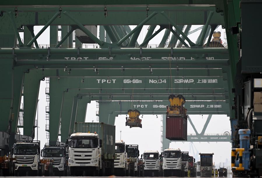 Trucks carrying containers are pictured at a container terminal of Tianjin Port in north China's Tianjin, April 8, 2025. (Xinhua/Zhao Zishuo)