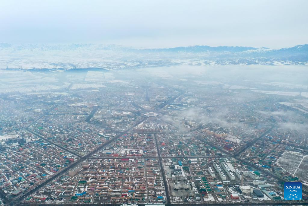 An aerial photo taken on Jan. 9, 2025 shows a view of Tekes County in Ili Kazak Autonomous Prefecture, northwest China's Xinjiang Uygur Autonomous Region.