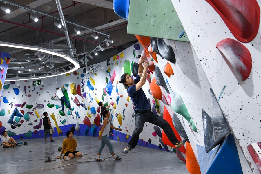 Young people attend a rock climbing activity after work at a climbing gym in Shenzhen, south China's Guangdong Province, April 26, 2024. (Xinhua/Liang Xu)