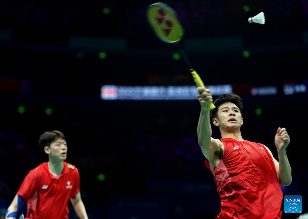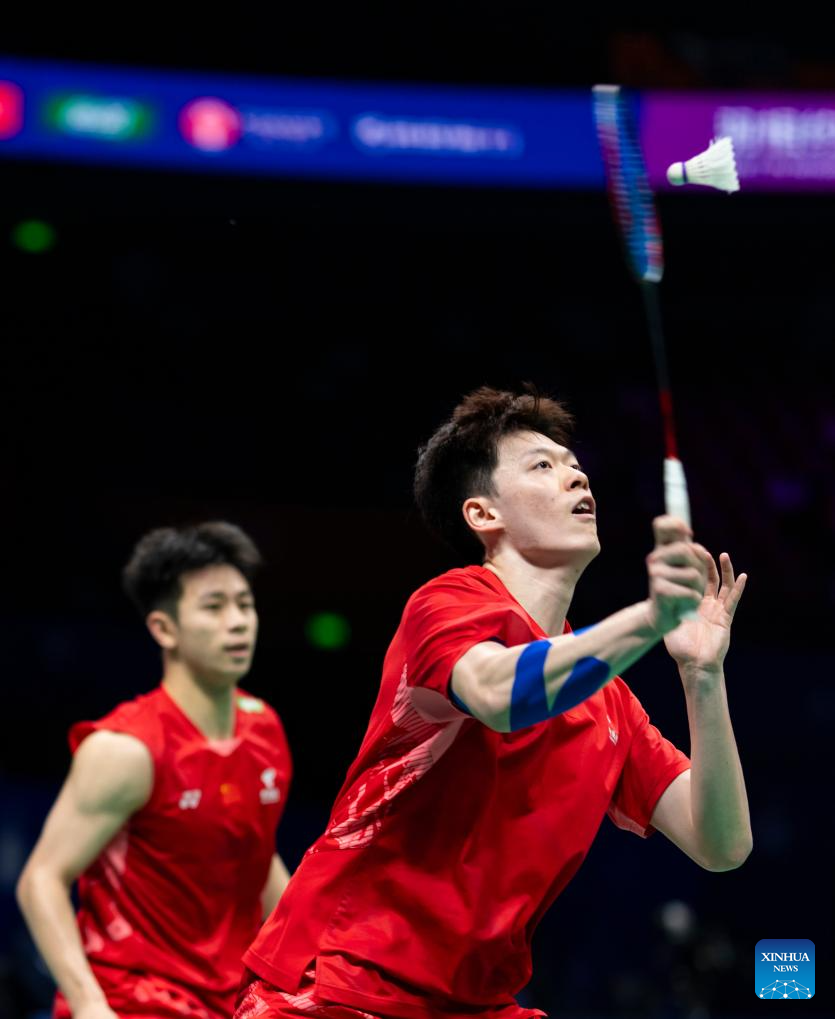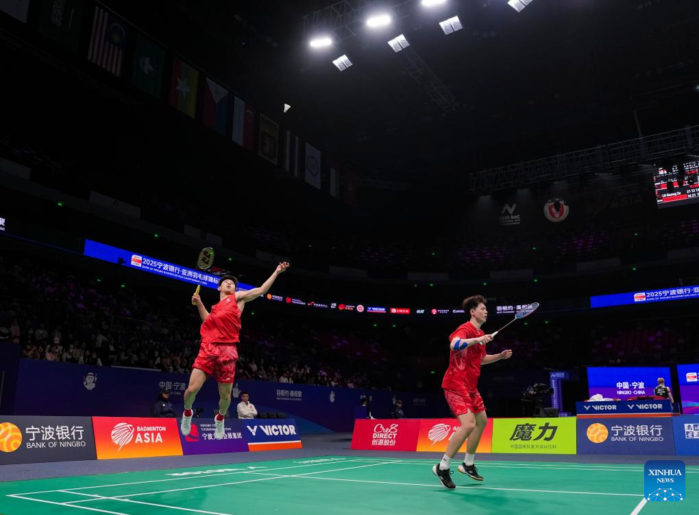 Chen Boyang (R)/Liu Yi of China compete during the men's doubles round of 32 match against Sabar Karyaman Gutama/Moh Reza Pahlevi Isfahani of Indonesia at Badminton Asia Championships 2025 in Ningbo, east China's Zhejiang Province, April 9, 2025. (Xinhua/Sun Fei)