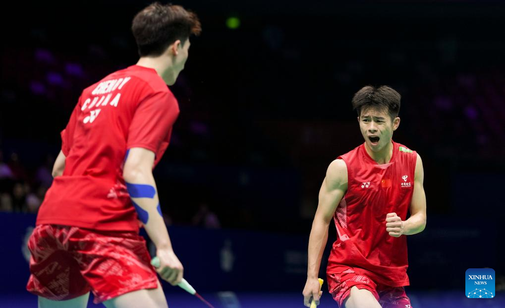 Chen Boyang/Liu Yi (R) of China react during the men's doubles round of 32 match against Sabar Karyaman Gutama/Moh Reza Pahlevi Isfahani of Indonesia at Badminton Asia Championships 2025 in Ningbo, east China's Zhejiang Province, April 9, 2025. (Xinhua/Sun Fei)