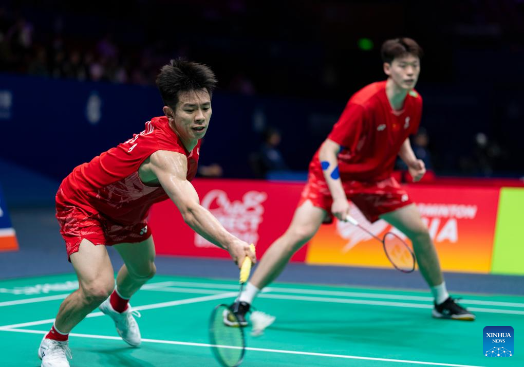 Chen Boyang/Liu Yi (R) of China compete during the men's doubles round of 32 match against Sabar Karyaman Gutama/Moh Reza Pahlevi Isfahani of Indonesia at Badminton Asia Championships 2025 in Ningbo, east China's Zhejiang Province, April 9, 2025. (Xinhua/Sun Fei)
