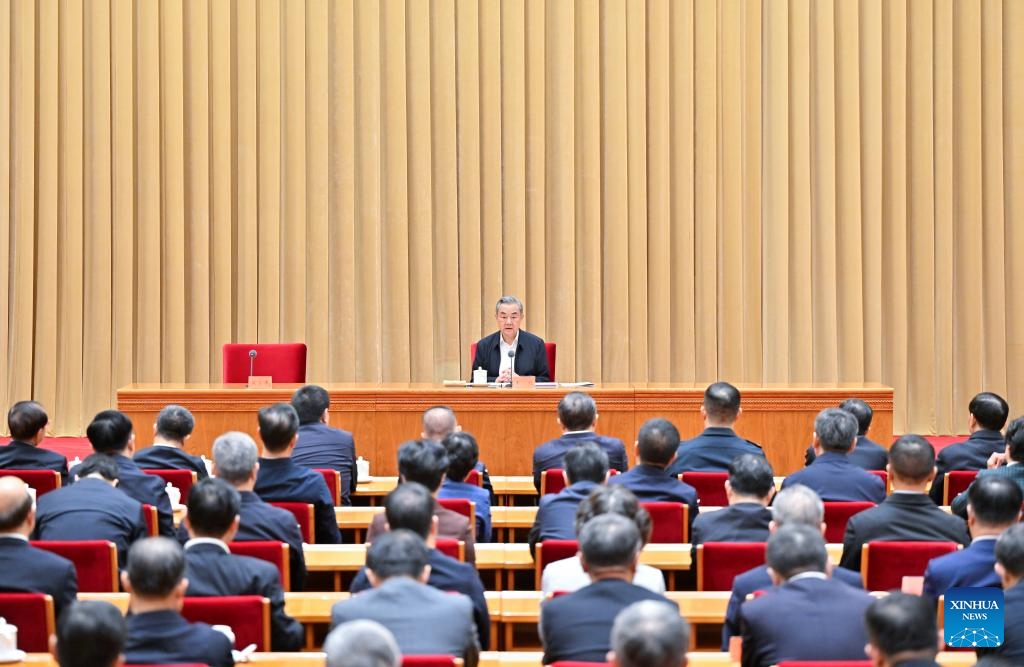 Chinese Foreign Minister Wang Yi, also a member of the Political Bureau of the Communist Party of China (CPC) Central Committee and director of the Office of the Foreign Affairs Commission of the CPC Central Committee, gives concluding remarks at a central conference on work related to neighboring countries in Beijing, capital of China, April 9, 2025. The conference was held in Beijing from Tuesday to Wednesday. (Xinhua/Yue Yuewei)