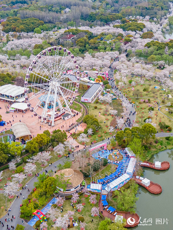 Photo shows an enchanting spring view of cherry blossoms in a park in Balingshan township, Jingzhou district, Jingzhou, central China's Hubei Province, March 26, 2025. (People's Daily Online/Wang Guoji)