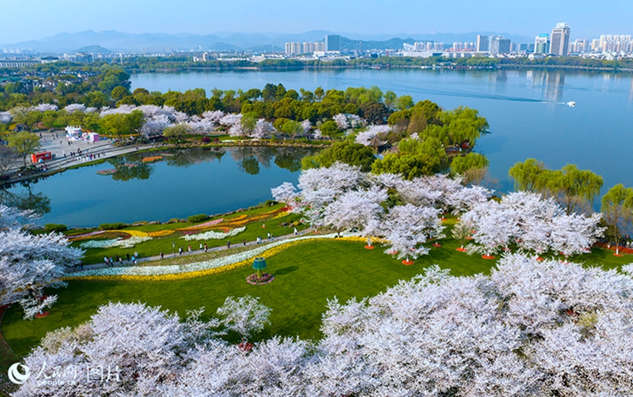 Photo shows an aerial view of cherry and tulip blossoms in full bloom by Guazhu Lake in Keqiao district, Shaoxing, east China's Zhejiang Province, March 26, 2025. (People's Daily Online/Zhang Yongtao)