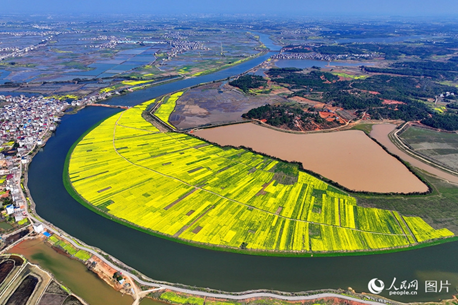Photo shows an aerial view of golden fields of rapeseed flowers shaped like a crescent moon in Shenbu village, Santang township, Yugan county, east China's Jiangxi Province, March 18, 2025. The unique spring view draws tourists from across the country. (People's Daily Online/Zhu Haipeng)