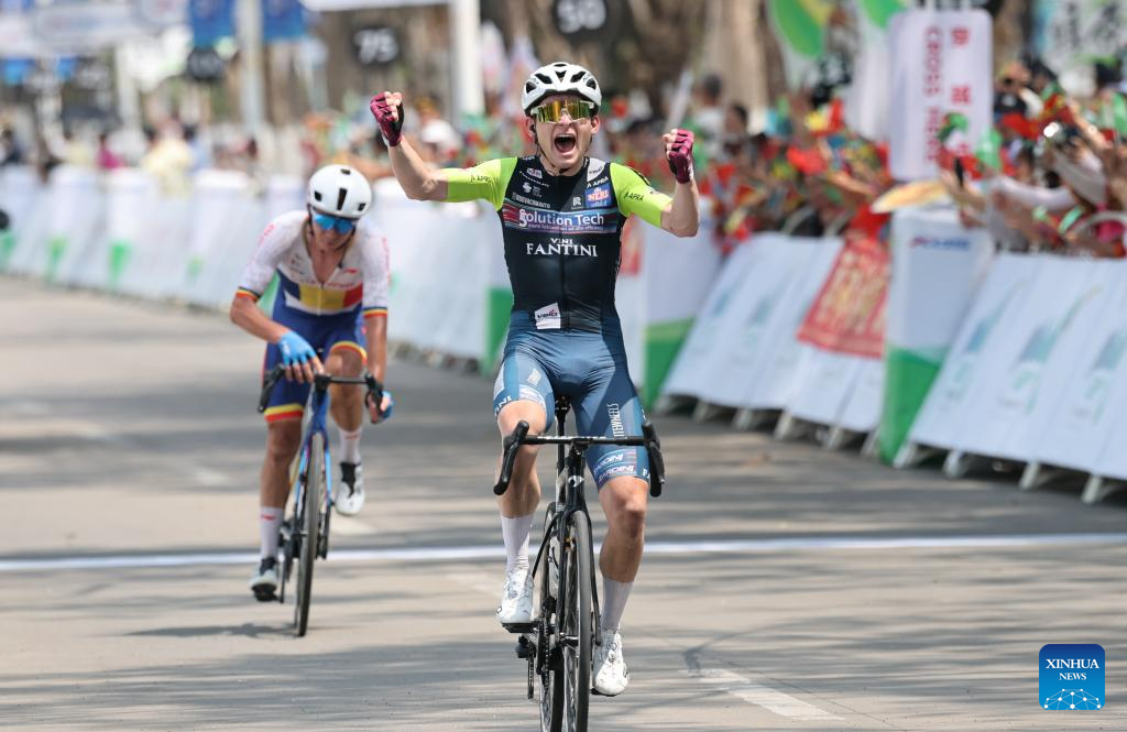 Kyrylo Tsarenko (R) of Solution Tech Vini Fantini celebrates winning Stage 3 at the 16th Tour of Hainan cycling race from Lingshui to Baoting, south China's Hainan Province, April 9, 2025. (Xinhua/Yang Guanyu)